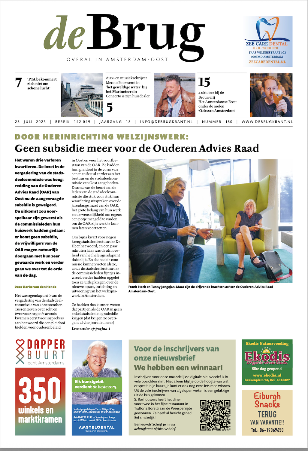De belangrijke Ouderen Adviesraad Oost krijgt geen subsidie meer. Toine Heijmans struint in rond in het circuskampje vlak bij de Nesciobrug. Schrijver Menno Pot heeft De Jas aan, hij rept over zijn ‘huisdealer’. Een kunstproject in de Betondorp maakt eenzaamheid bespreekbaar, de burgermeester was op IJburg en onder veel meer waarom het Flevopark zo pikkedonker is lees je allemaal in nummer 180. Hier is de nieuwe de Brug, zoals altijd met veel plezier gemaakt.