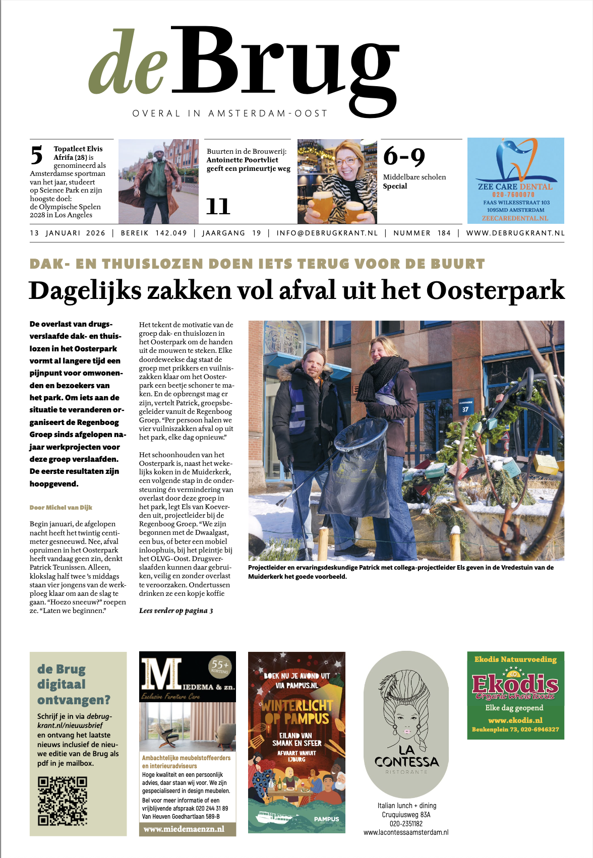 Mooie werkprojecten met dak- en thuislozen rond het Oosterpark, een special over middelbare scholen in Amsterdam, een column over ’t Nieuwe Diep, Robert die houdt van groeten en buiten de lijntjes kleuren, toch wel weer een volle agenda etc etc etc. Hier is de nieuwe de Brug, zoals altijd met veel plezier gemaakt.