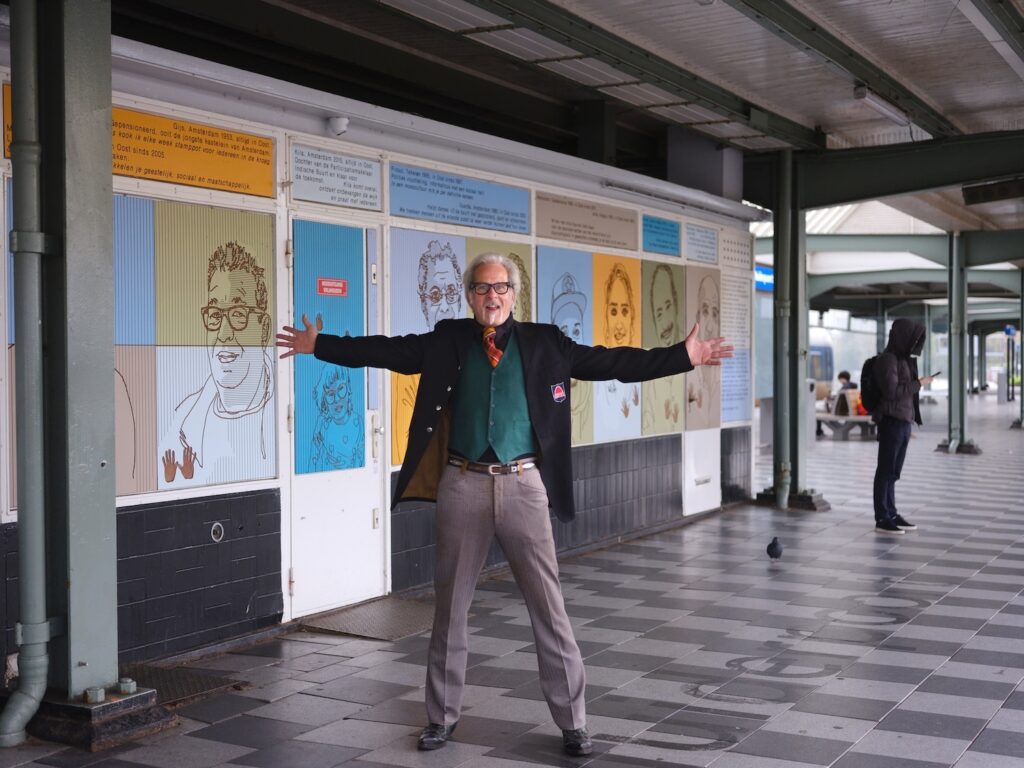 Op perron 4 van het Muiderpoortstation staan reizigers rustig te wachten op de trein die hen naar hun bestemming gaat brengen. De meesten staren met gebogen hoofd naar het kleine apparaatje in hun handen. Ze worden gadegeslagen door de kleurrijke afbeeldingen van buurtbewoners die op de stationsrestauratie zijn afgebeeld. Wellicht kijken ze naar hun eigen buren.