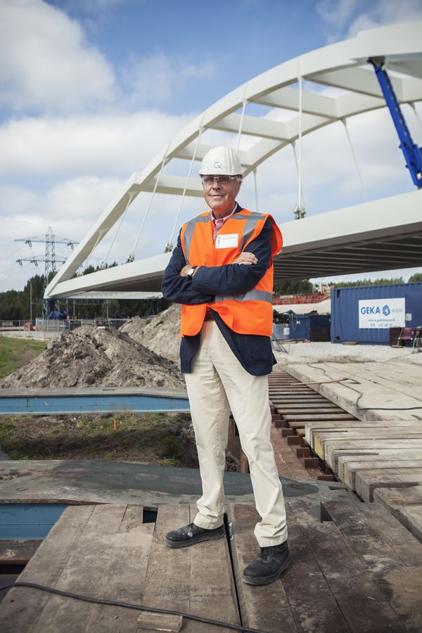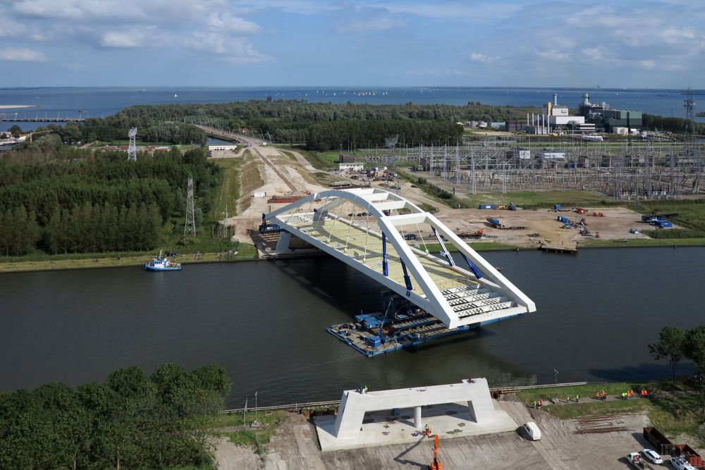 Op de achtergrond varen de schepen over het Amsterdam-Rijnkanaal, zoals altijd zo’n 350 per dag. Maar niet op 15 september. Want toen werd de boog over het water gehangen.