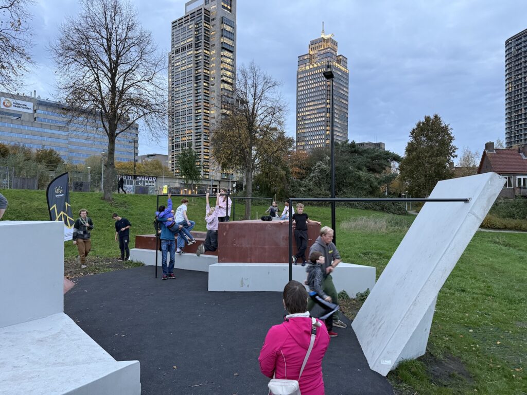 Stadsdeelbestuurder Zeeger Ernsting opende op een mooie woensdag in november het nieuwe freerun- en skatepark in de Starrenboschstraat in Amsteldorp. De architect heeft zich bij het ontwerp laten inspireren door de karakteristieke bouwstijl van de wijk.