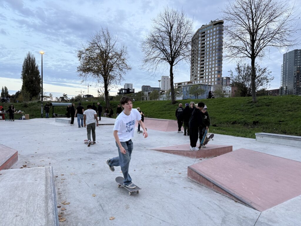 Tussen de ramps van het skatepark en de obstakels van het freerunparcour is een lint gespannen dat later symbolisch zal worden doorgeknipt. De alom aanwezige skaters wachten echter niet op dat moment en maken de nodige kick turns, een trucje waarbij de voorste wielen loskomen van de grond en ollies, het foefje waarbij het skatebord tijdens het springen aan de voeten blijft plakken.