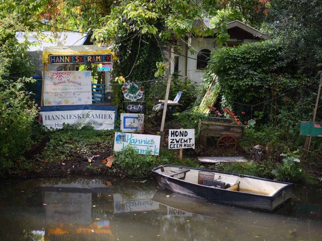 Maar hier hebben ze geluk: dit is een woonwagenkampje en de stad heeft sinds kort een welwillend woonwagenbeleid. Ik fiets er al twintig jaar langs met vragen die de honderden andere langsfietsers vast ook hebben, maar nooit durven te stellen. Over die opslagcontainers. Over die nepreiger in de sloot. Over die auto met letters op de achterruit geplakt: POLITIEK IS MISDAAD. Over de uil. Over de zwarte hond die naar adem happend zwemt in de sloot, en kennelijk zo vaak gered wordt dat er nu een bordje staat met HOND ZWEMT GEEN HULP. Een bordje kennelijk neergezet door Hannie van Hannies Keramiek, een gepensioneerde circusartieste die kleine rode klaprozen maakt van klei.
